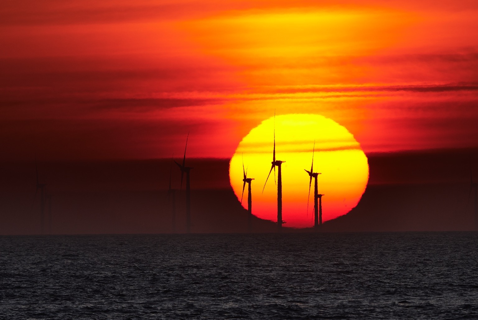 Coucher de soleil derrière les éoliennes au large de Saint-Nazaire