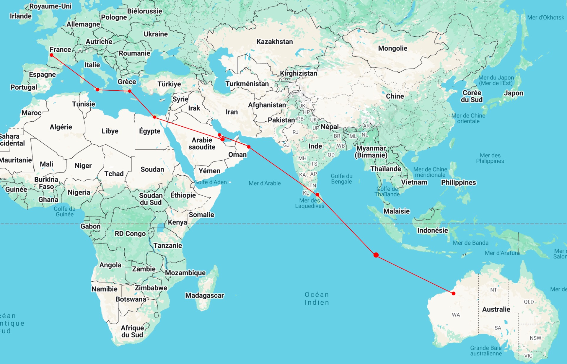 Le trajet : Bordeaux-Malte-Grece-Egypte-Arabe Saoudite-Oman-Sri-Lanka-Coco Island- pour arriver en Australie au bout de 6 jours. Et ce n'est pas fini, Adelaïde est de l'autre coté de l'ile -continent.